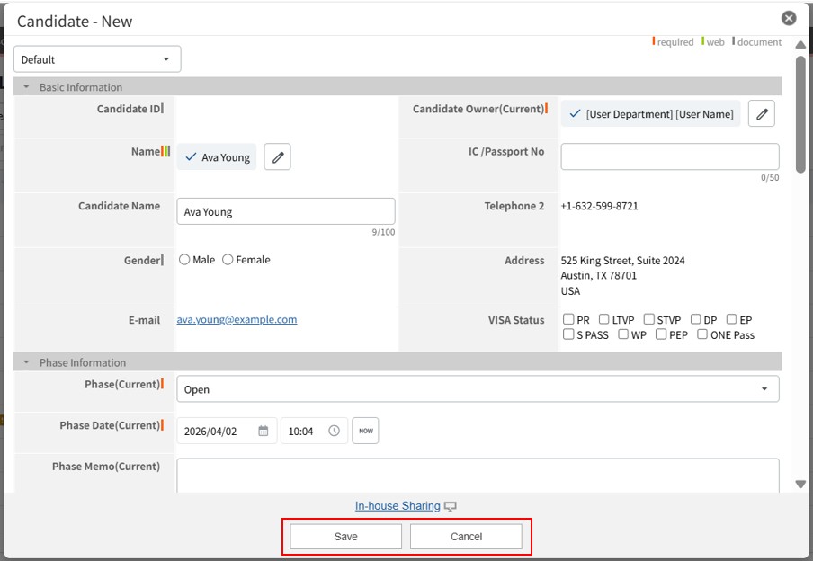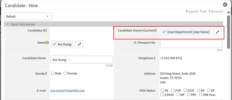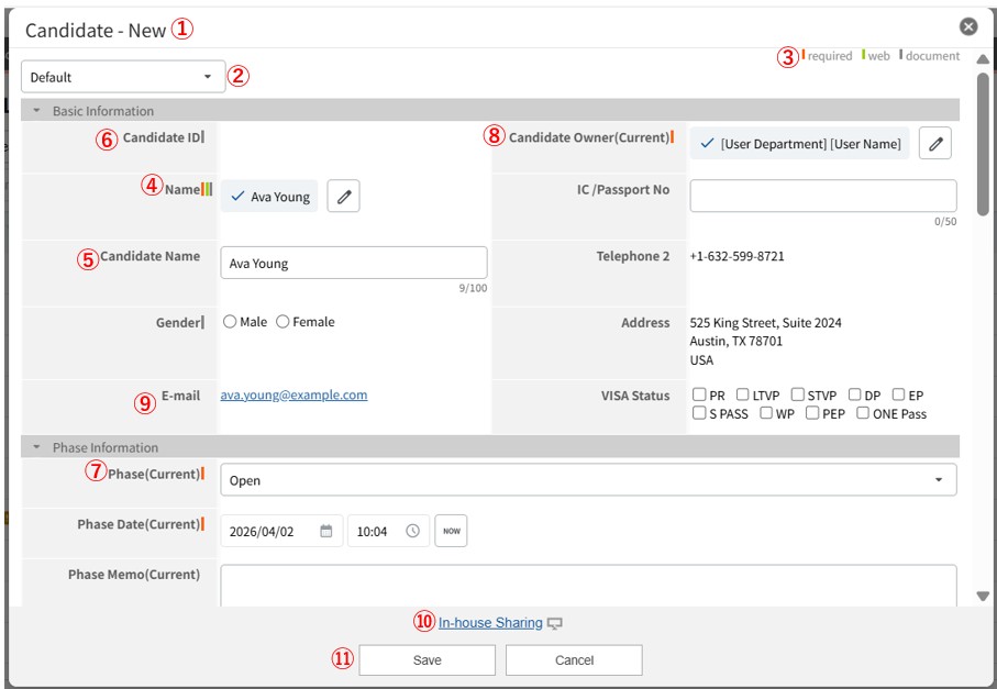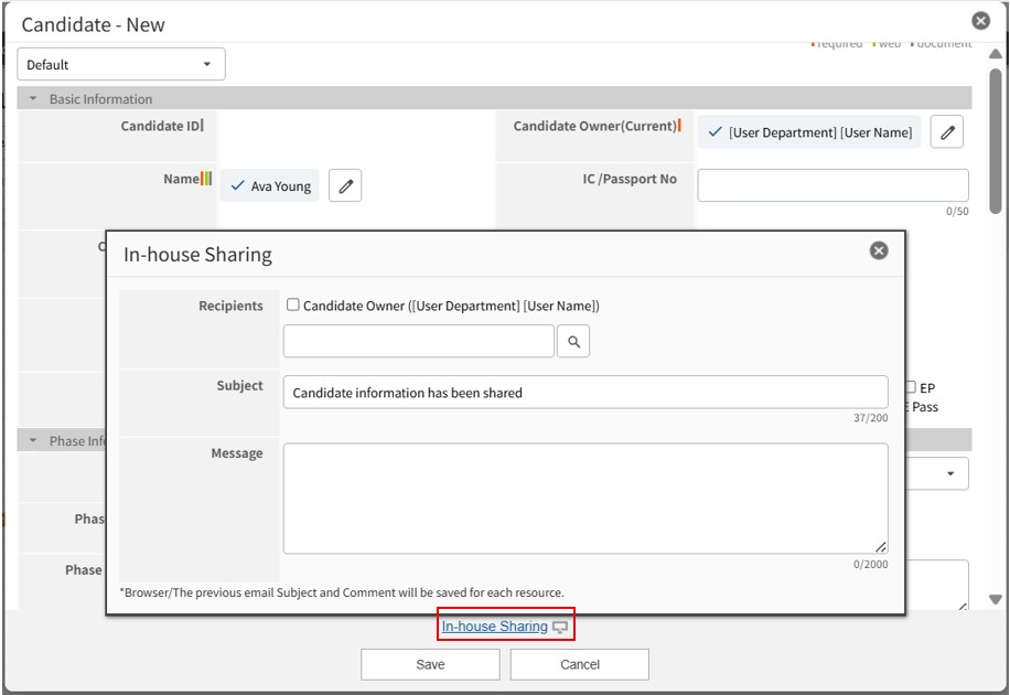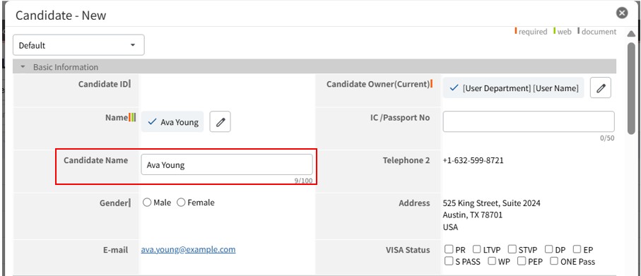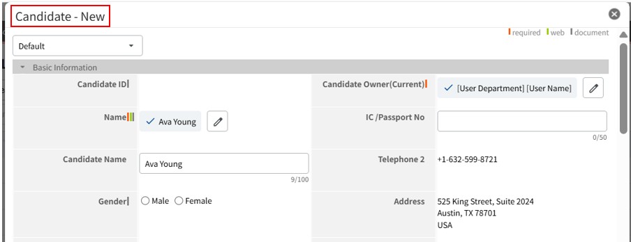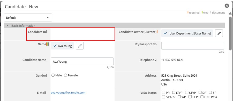 If the field is blank when the record is saved, the system automatically references the name in Personal-Data and the Candidate ID, and registers it as "Name (ID)".