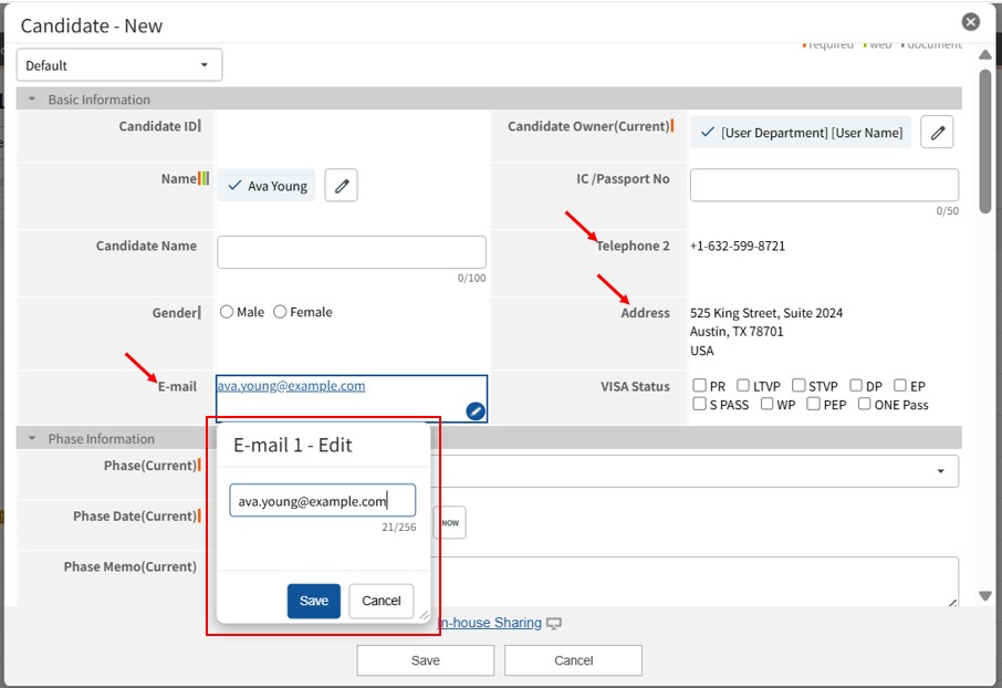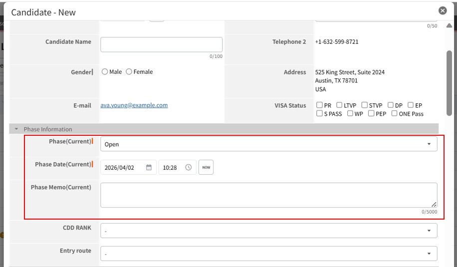 - "Phase" is an Option-type field. It is common to prepare options that indicate progress (e.g., "OPEN", "JOB proposal in progress", "Offer accepted", etc.).