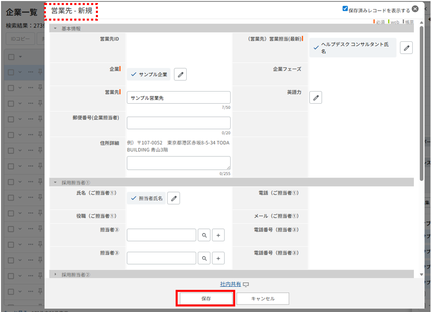 画面左上に「企業担当者 - 新規」と表示された画面が開かれますので、必要事項を入力し保存してください。