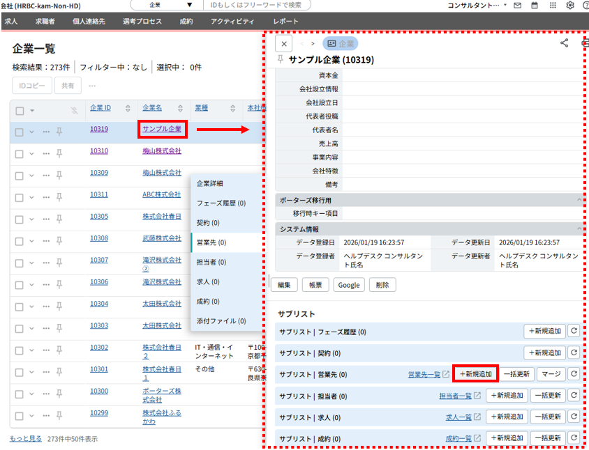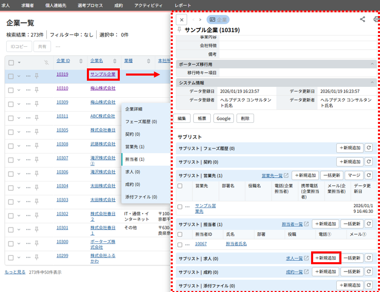 企業の詳細画面で、サブリストには登録した「企業担当者」のデータが表示されましたので、続けて「JOB」の「新規追加」を行います。