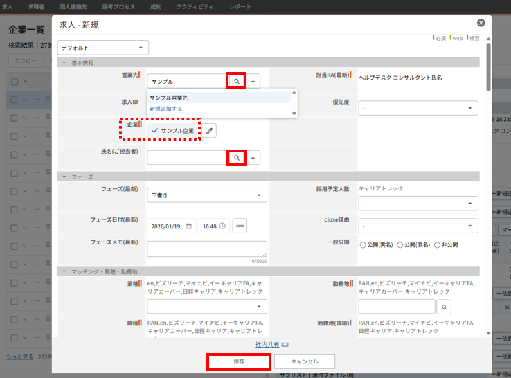 「求人 - 新規」画面が開きますので、必要事項を入力し保存してください。