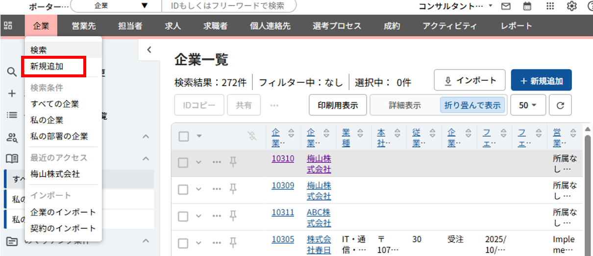 まずは「企業」データを登録するため、グローバルメニューの「企業」をクリックし、「新規追加」を選択します。