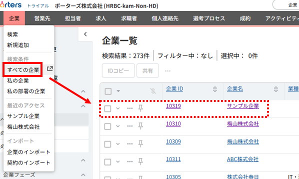 登録したデータを確認したい場合、グローバルメニューの「企業」をクリックし「すべての企業」を選択します。