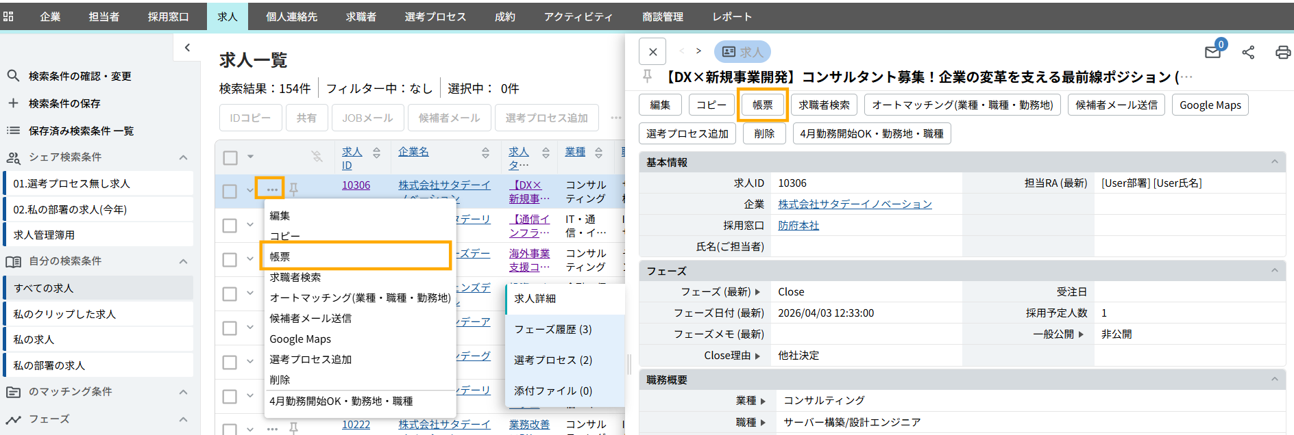 帳票を作成するには、帳票を作成したいデータのアクションボタンをクリックし、アクションメニューから「帳票」または「~をPDF化する」をクリックします。