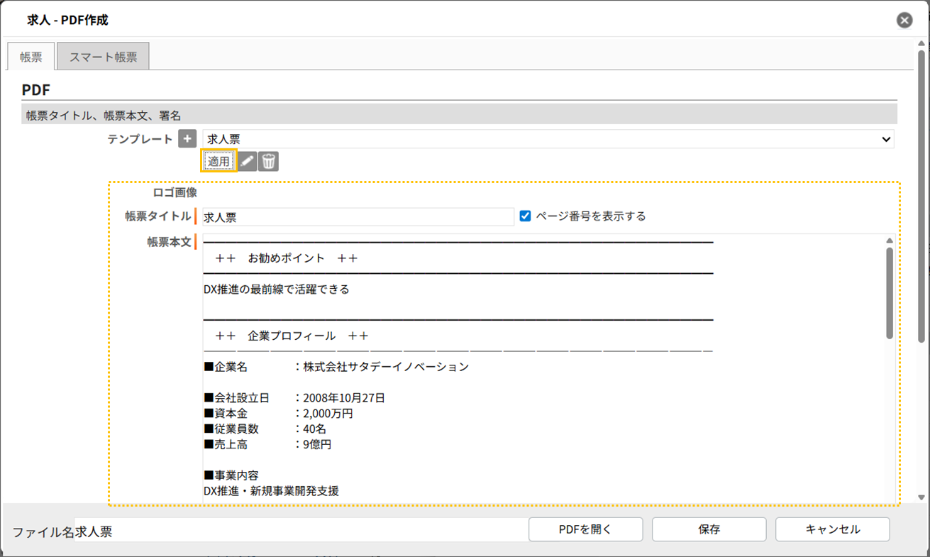 テンプレート選択後、「適用」をクリックすると、選択したテンプレートの内容が反映されます。必要に応じて更に、『帳票タイトル』や『帳票本文』を追記・修正してください。