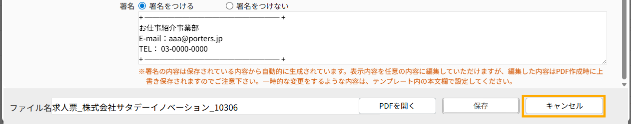 帳票の作成画面に戻りますので『キャンセル』をクリックして画面を閉じます。