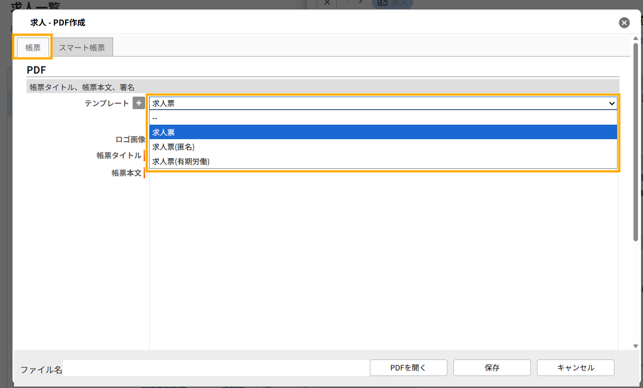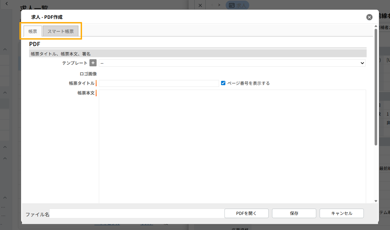 PDF作成画面にて、左上のタブから『スマート帳票』を選択します。