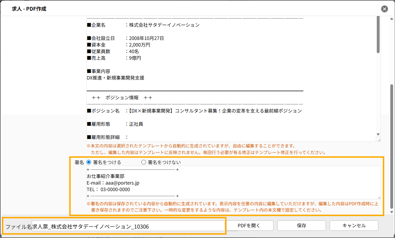 PORTERSでは、登録されているデータをもとに求人票や登録票などの帳票(PDF)を作成することができます。