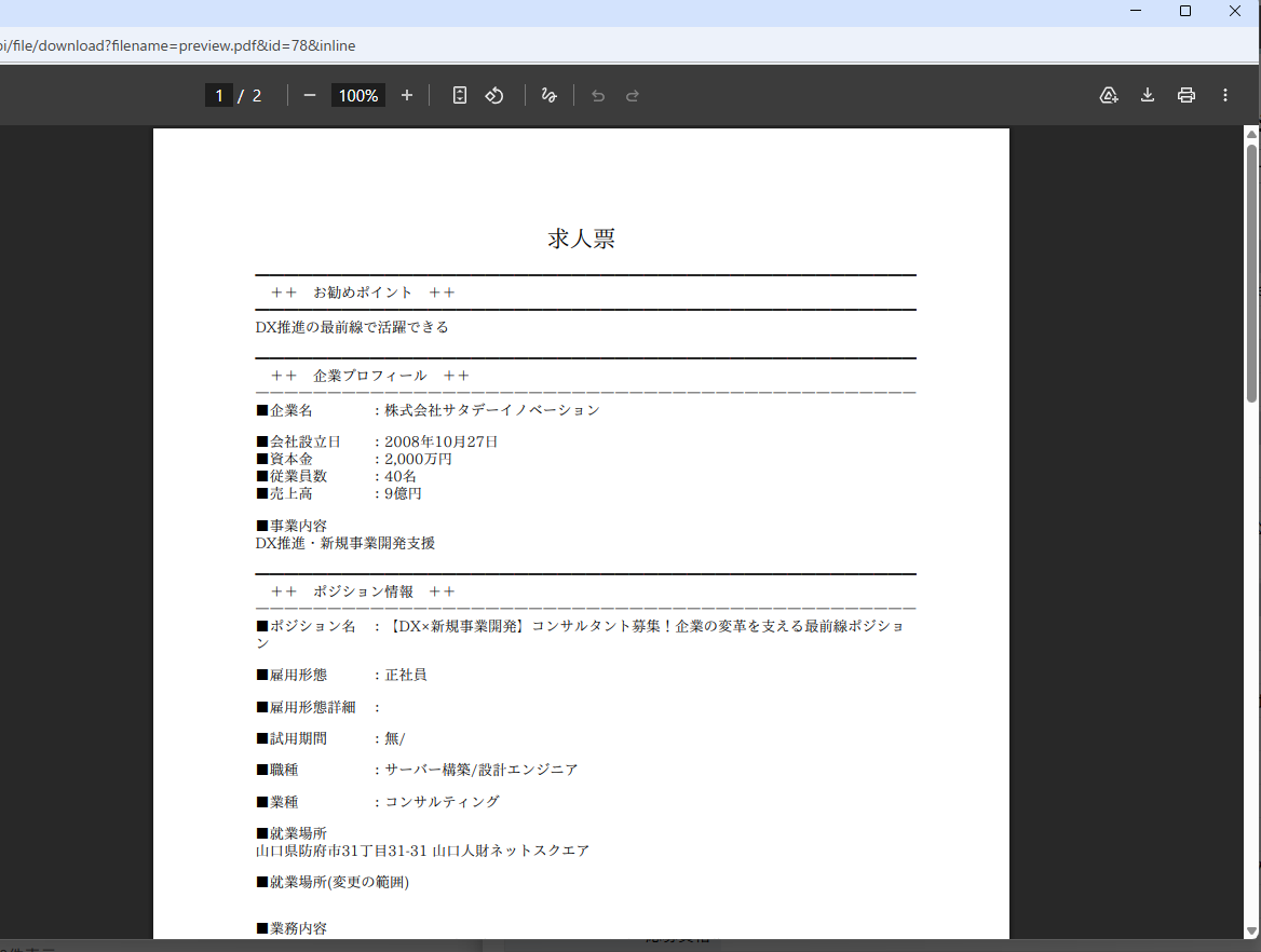 『PDFを開く』ボタンをクリックすると、ポップアップ画面にてPDFのプレビューが表示されます。