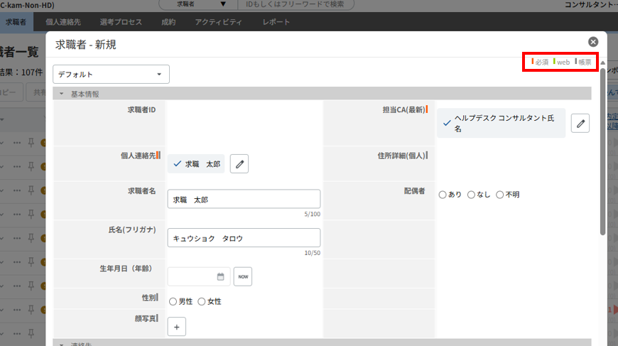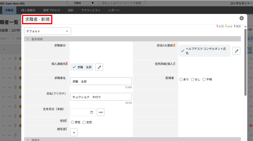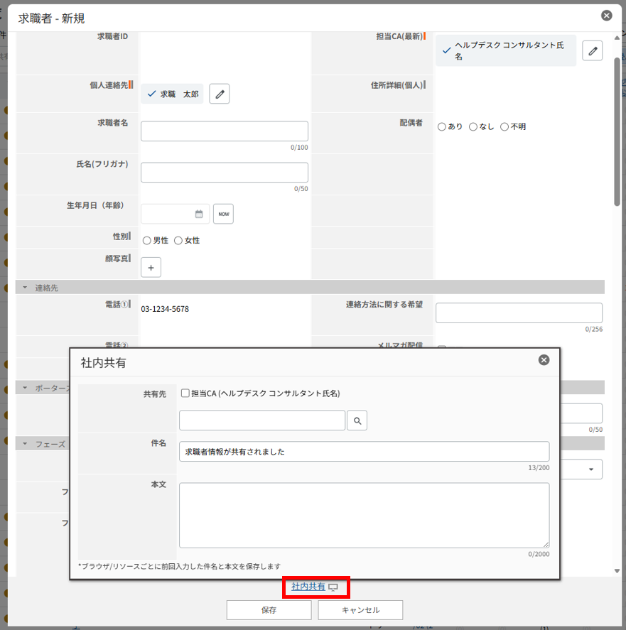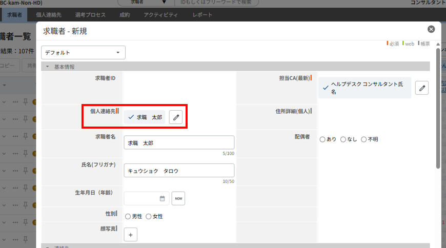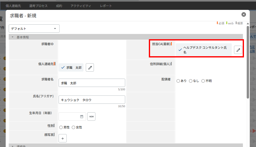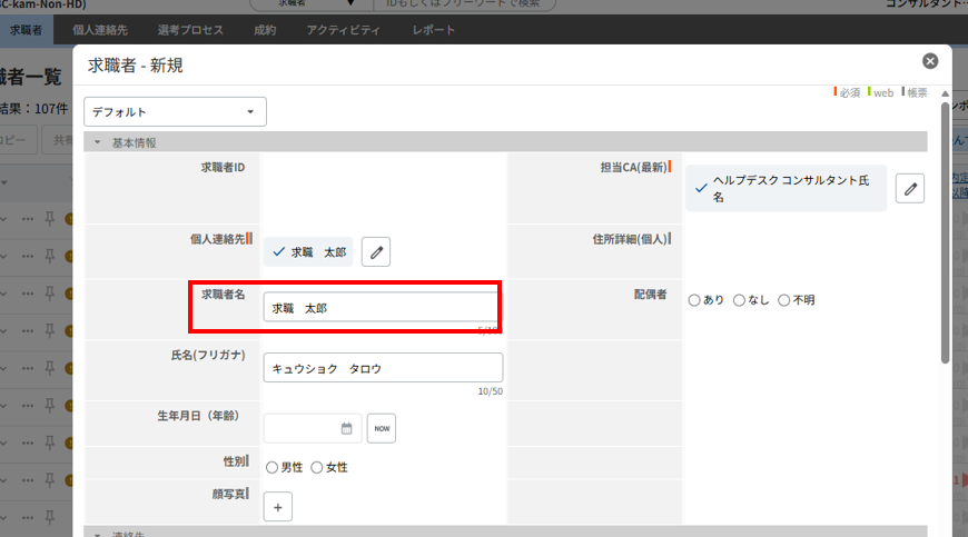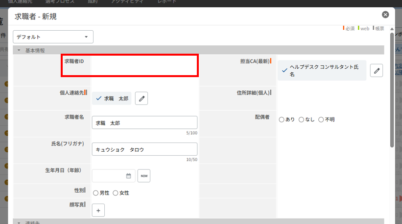 項目が空欄の状態でデータの保存が実行されると、個人連絡先の氏名と求職者のIDを自動参照し、「氏名(ID)」として登録します。