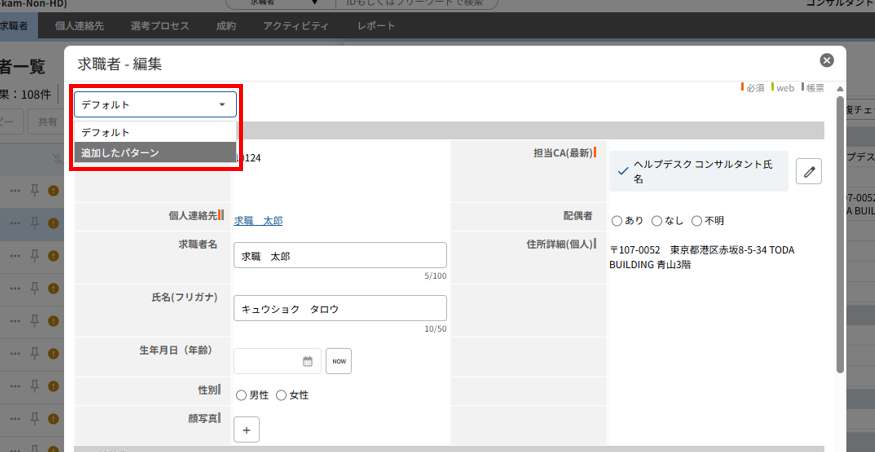 デフォルトでは求職者名は非表示になっているため、編集する場合はカスタマイズで項目を表示してから行ってください。