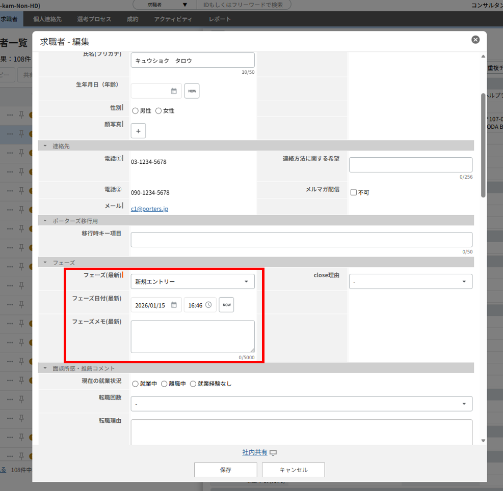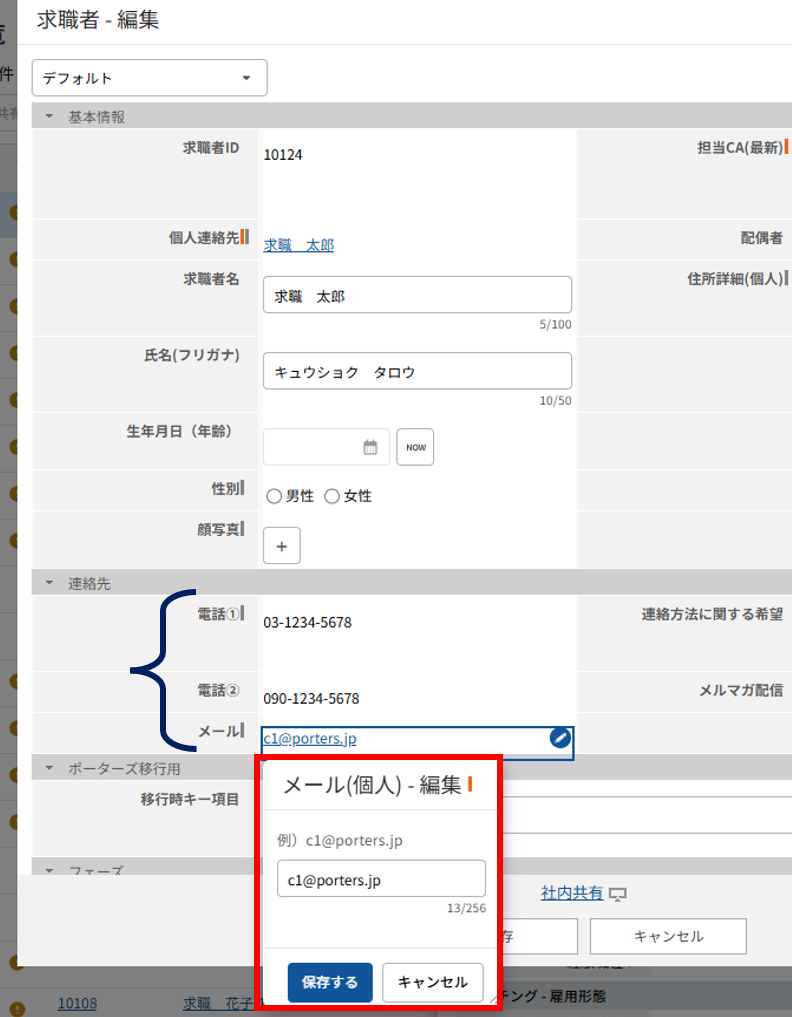 求職者の氏名を修正する場合には、個人連絡先の氏名と合わせて求職者名に入力されている内容も修正する必要があります。