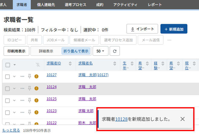 データの新規追加を行った際、画面右下に通知のポップアップが表示され、数秒経過後に自動的に消失します。(下記の黄色枠)