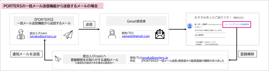 1.「PORTERSの一括メール送信機能から送信するメール」をGmailアカウント宛へ送信した際、「登録解除リンク」が表示される対応。