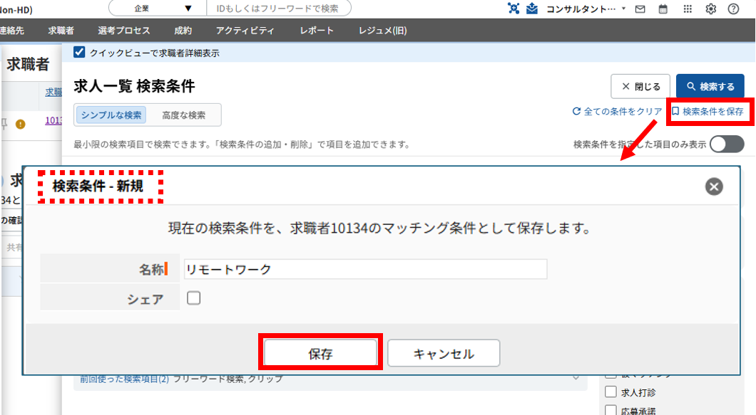 また、「検索条件を保存」をクリックしますと、クイックビューで表示されている求職者個別のマッチング条件として、検索条件を保存することができます。