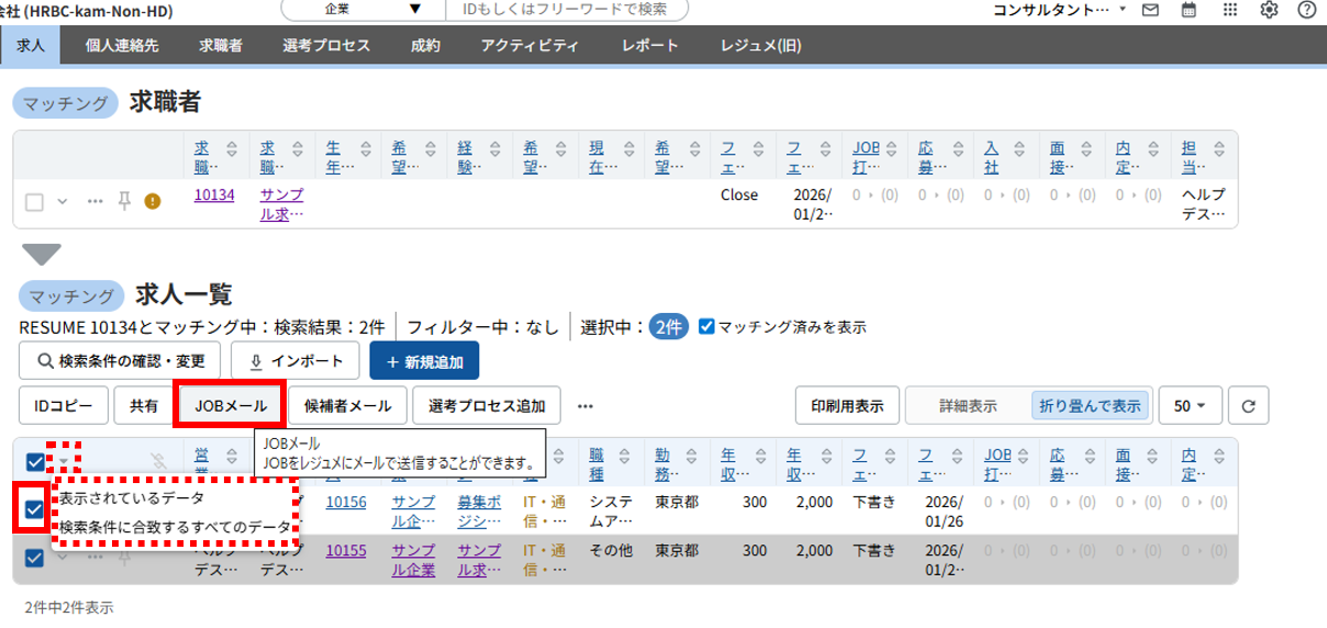 ※「検索条件に合致するすべてのデータ」は検索結果の全件が対象となります。「マッチング済みを表示」のチェックを外している場合、選考プロセスが作成されている求人は非表示となりますが、非表示のデータも対象となりますので、ご注意ください。