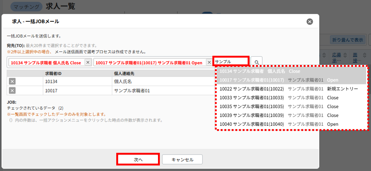 なお、別の求職者にも、同じ求人のJOBメールを送信する事が可能です。宛先として、最大20件までの求職者を選択することができます。宛先を選択する際は、求職者 ID