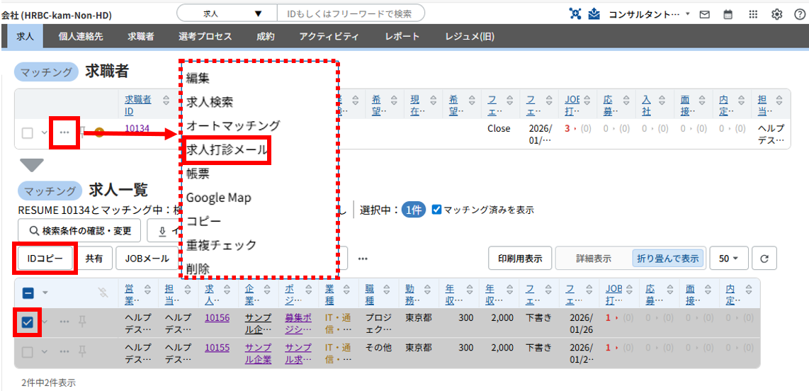 マッチング結果のJOB一覧で、打診するJOBにチェックを入れ、「IDコピー」をクリックします。
