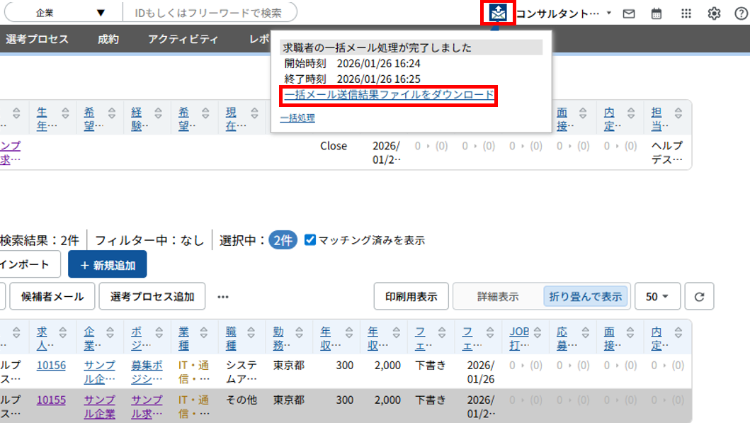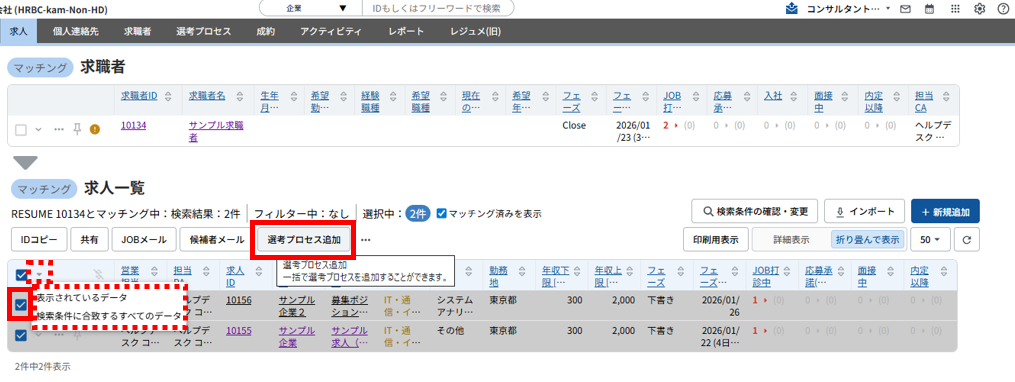 ※「検索条件に合致するすべてのデータ」は検索結果の全件が対象となります。「マッチング済みを表示」のチェックを外している場合、選考プロセスが作成されているJOBは非表示となりますが、非表示のデータも対象となります。(但し、実行しても「すでに選考プロセスが登録されています」というエラーになります。)