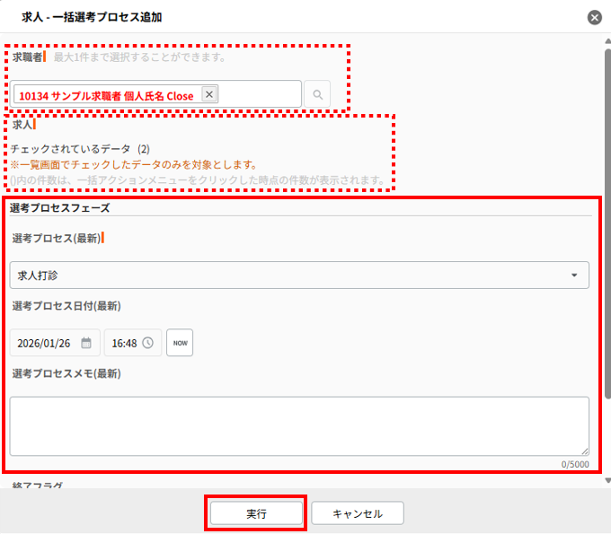 「求人-一括選考プロセス追加」画面にて、表示される各項目の値を入力し、「実行」をクリックします。