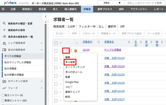 PORTERSのマッチング機能では、「求職者」レコードを軸にして求人をマッチングすることも、