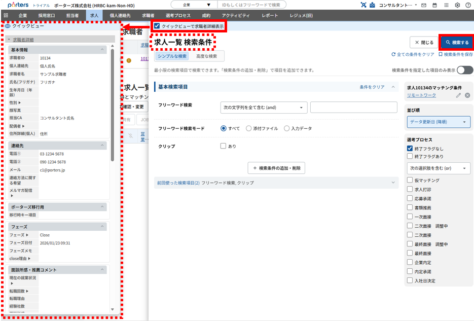 「クイックビューで求職者詳細表示」にチェックが入っている場合、画面左側に、該当の求職者の詳細情報が表示されます。