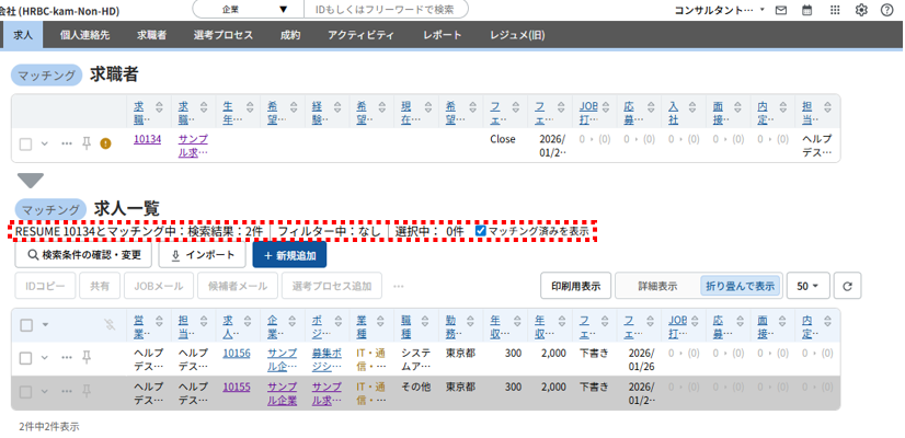 画面上部にマッチングの軸とした求職者レコードが表示され、その下に「RESUME (求職者ID)とマッチング中 マッチング済みを表示」と表記されたマッチング結果の求人一覧が表示されます。
