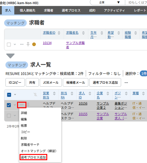 対象とする求人レコードのアクションメニュー「・・・」ボタンの「選考プロセス追加」をクリックします。