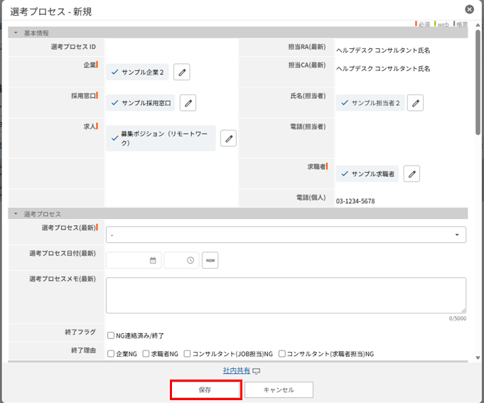 JOBとレジュメが紐づいた状態になっているので、その他の項目を入力し、保存します。