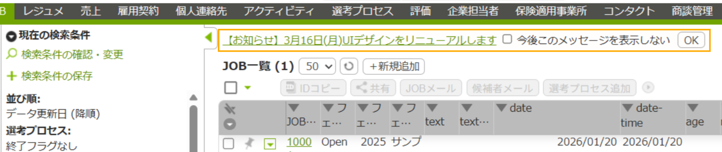 2.一覧画面上部に、UIリニューアルおしらせページへの リンクテキストを表示します。
