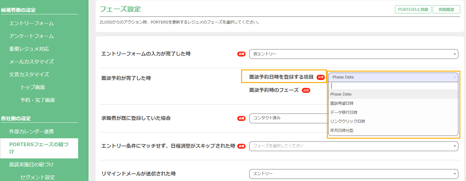 PORTERSフェーズの紐づけ > フェーズ設定画面の【面談予約が完了した時】に、新たに【面談予約日時を登録する項目】を追加します。